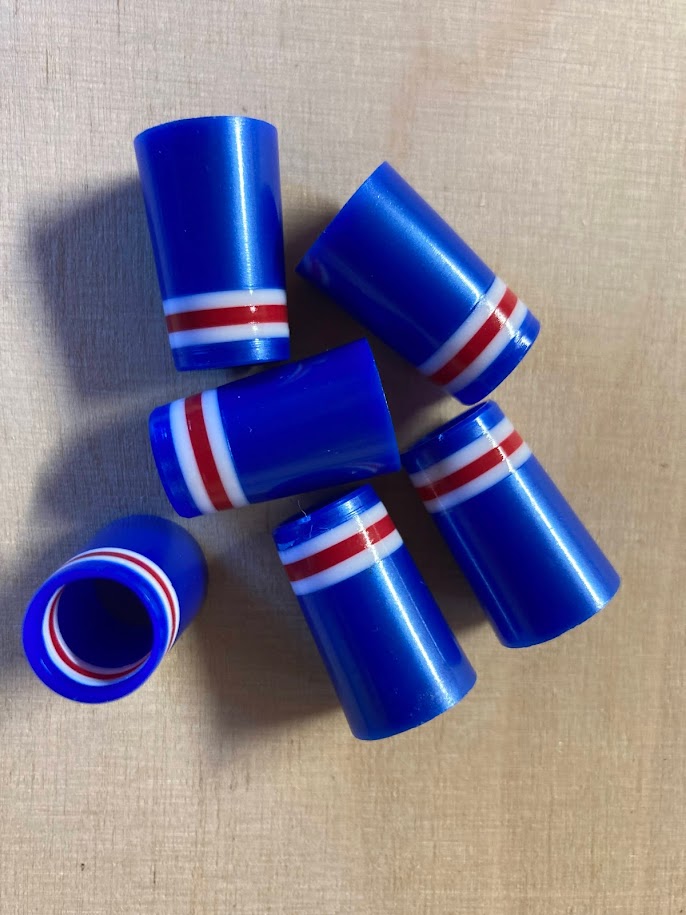 Sininen, hieman metallin hohtoinen, ferrule, jossa valkoisella pohjalla punainen raita.