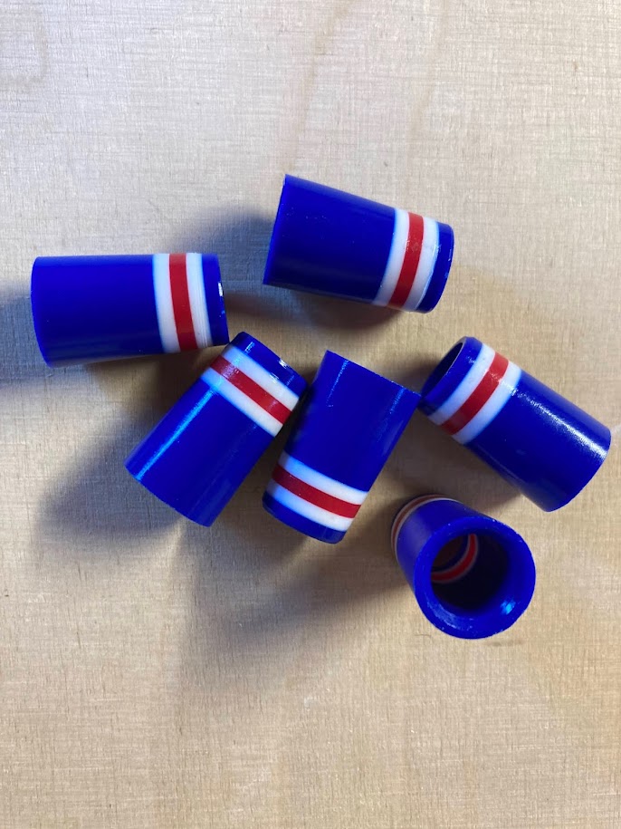 Sininen ferrule, jossa valkoiset ja punainen raita.