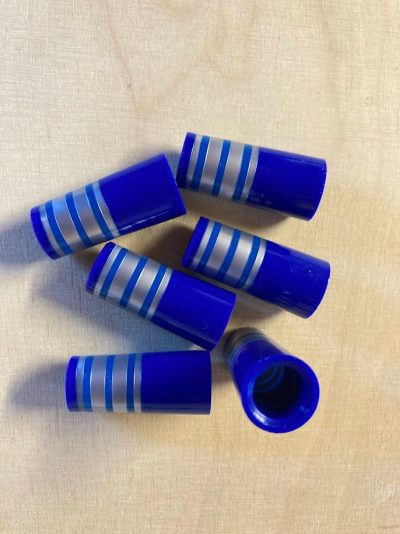 Sininen ferrule, jossa eri vahvuisia hopeisia raitoja.