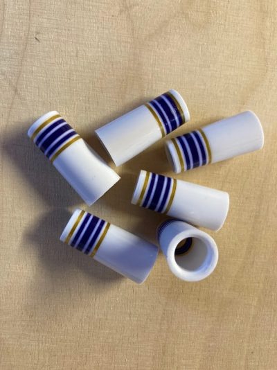 Valkoinen ferrule, jossa erivahvuisia sinisiä, kultaisia ja valkoisia raitoja.