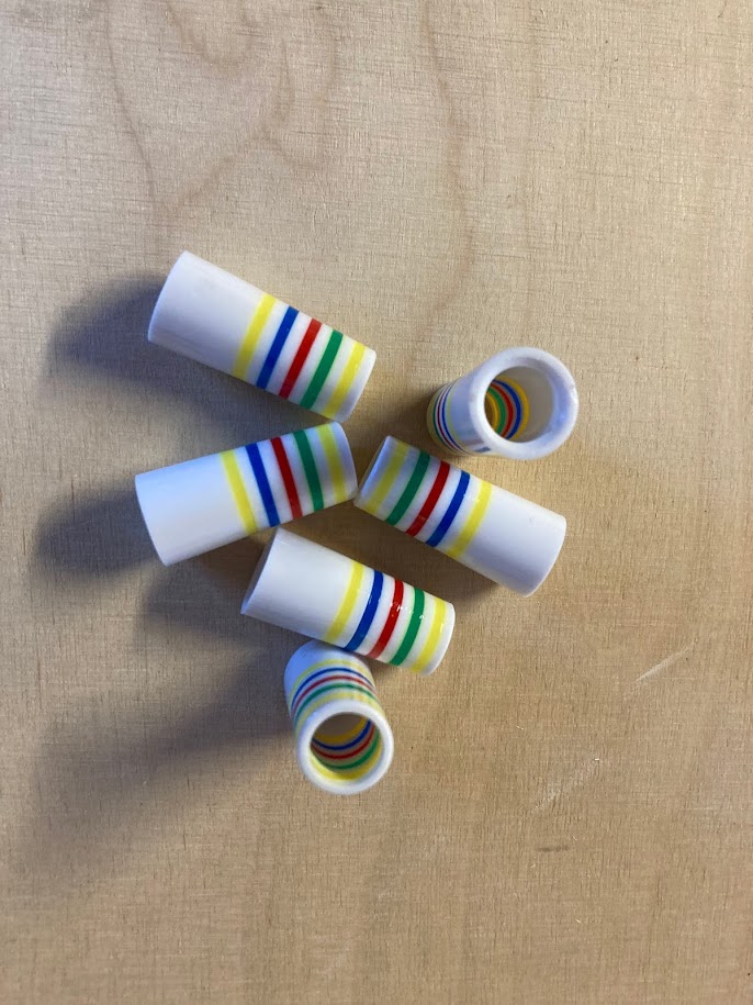 Valkoinen ferrule jossa pirteän värikkäät raidat.