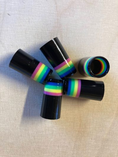 Musta ferrule, jossa värikkäät sateenkaariraidat.