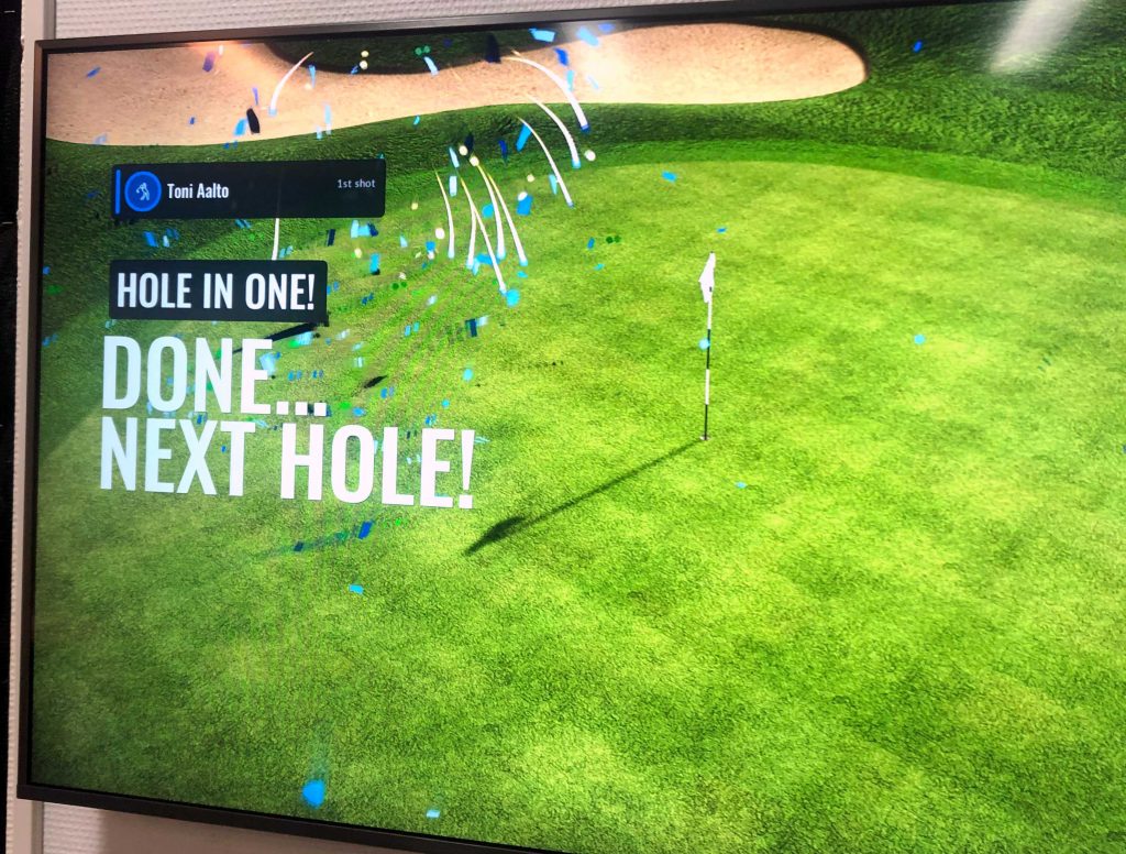 Väylä numero 17, par 3, 135 metriä alamäkeen. Bunkkeri edessä ja greeni kapeahko. Tuuli oli sopiva pienelle fadelle. Mailavalintana rauta 8 ja 3/4 lyönti vähän normaalia matalampana. Se oli suunnitelma johon sitouduin. Astuin pallolle ja annoin mennä, kohteeseen. Nätti kaarii ja pallo parin pompun kautta kuppiin. Hymyilytti. Nautin tilanteesta, joka oli tietyllä tapaa aika absurdi. Tätä olin lähtenyt testaamaan ja hakemaan. En välttämättä Hole in Onea mutta hyviä lyöntejä oikealla focuksella.