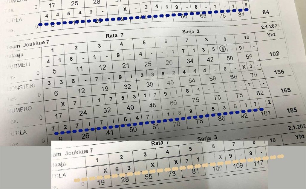 Ennen kolmatta sarjaa tajuan oman hölmöyteni, nauran. Valmennan ja puhun tästä asiasta mutta itse sorruin siihen pahimpaan. Ei tämän näin pitäisi olla. En ole hetkeäkään miettinyt kohdetta jonka haluan saavuttaa. Taidot eivät yksinkertaisesti riitä heittämään palloa kierteellä. Omat lajitaidot riittävät lähettämään pallon suoraan kohti ensimmäistä keilaa ja jos se jommalta kummalta puolelta menisi nätisti niin kaato on mahdollinen.